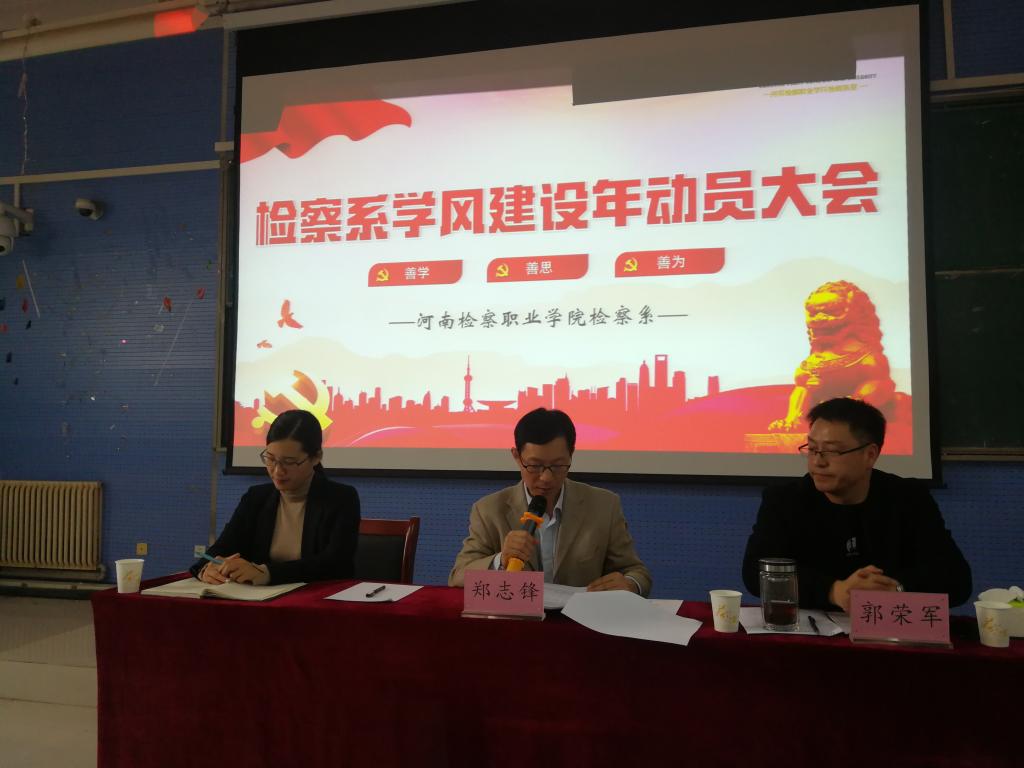 学风是大学精神的集中体现,是教书育人的本质要求,是高等学院的立校之本、发展之魂。为切实加强学风建设,营造良好学习氛围,提高人才培养质量,检察系组织开展以“善学 善思 善为”为主题的2020至2021学年学风建设活动。 11月17日,在图书馆2501教室召开了“学风建设年”启动大会。检察系主任郑志锋主持会议,副主任郭月霞、郭荣军、学生管理科科长张燕乐、全体辅导员及部分教师代表、学生党员和学生干部参加会议。
