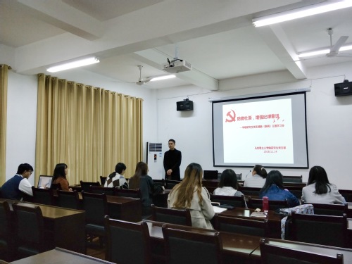 2018年11月14日,437必赢会员中心研究生党支部召开学习《中国共产党纪律处分条例》主题学习会,全体研究生党员参加,学习会由辅导员孔柠檬主持。