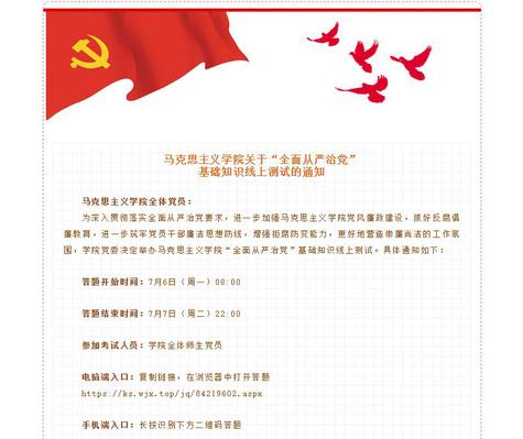 为深入贯彻落实全面从严治党要求,加强437必赢会员中心党风廉政建设,抓好反腐倡廉教育,进一步筑牢党员干部廉洁思想防线,增强拒腐防变能力,更好地营造崇廉尚洁的工作氛围。7月6日——7月7日,学院党委组织开展师生党员“全面从严治党”基础知识线上测试。