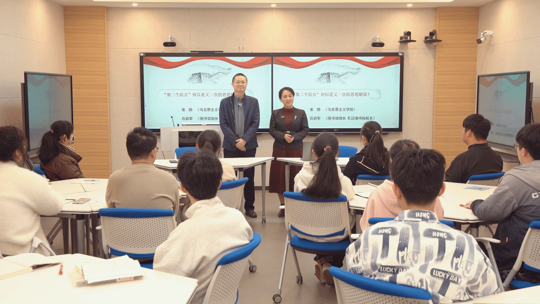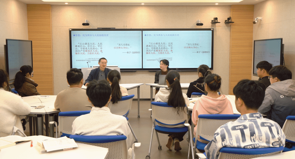 近年来,437必赢会员中心全面贯彻习近平总书记关于“大思政课”建设的重要讲话精神,围绕“问题式专题化”团队教学改革要求,积极探索“双师同堂”思政课教学模式,用好用活校内外资源,不断提高思政课的针对性和实效性。12月7日下午,学院教师张静与图书馆馆长、孔目湖书院院长石初军,在教36栋101室为2022级计算机专业的学生带来了一堂题为《“第二个结合”何以是又一次的思想解放》的 “双师同堂”示范课。