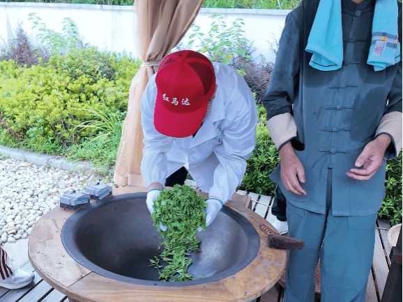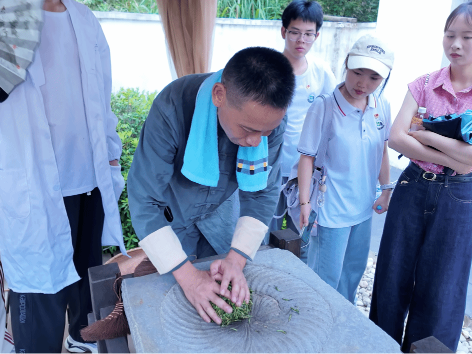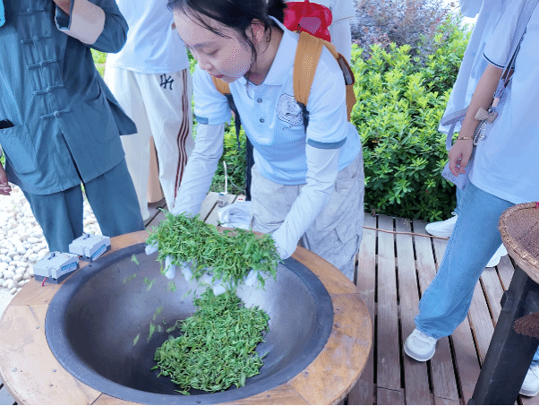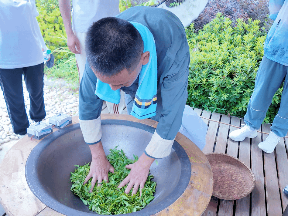 在非遗传承人的带领下,队员们观摩并亲身体验了云香茶从采茶、摊青、杀青、揉捻、复炒到干燥的全套传统工艺流程,队员们近距离观摩,并在师傅指导下尝试体验了部分环节。