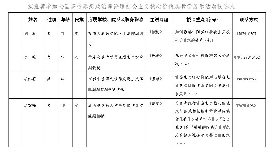根据《教育部社科司关于组织开展全国高校思想政治理论课社会主义核心价值观教学展示活动的通知》(教社科司函[2014]101号)精神,省教育厅组织了全省高校思想政治理论课社会主义核心价值观教学展示活动候选人的评选,各高校共推荐6名候选人参加了教学展示活动。