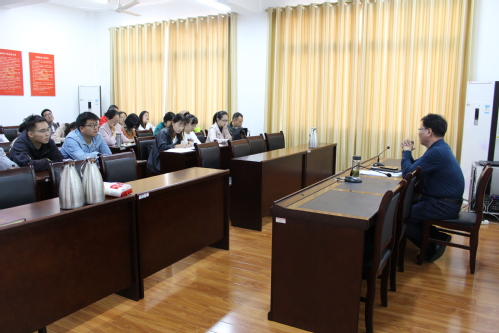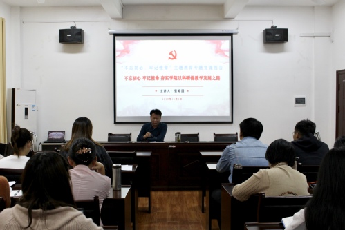 张昭国以“不忘初心、牢记使命——夯实学院以科研促教学发展之路”为题,结合主题教育学习、调研成果和自身体会,阐述了对初心和使命的感悟。他认为,初心决定使命,使命呼唤担当,在日常工作中要做到“不忘初心、牢记使命”就要讲政治,有信念、讲规矩,有纪律、讲道德,有品行、讲奉献,有作为。