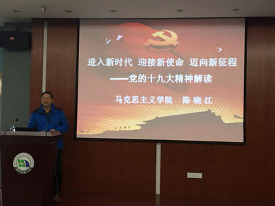 首先,陈晓江副院长对党的十九大报告具体内容进行了生动的解读,详细列举了本届大会取得的主要成果。在报告中,系统归纳了过去五年取得的历史性成就和历史性变革;深刻阐述了习近平新时代中国特色社会主义思想的时代背景、核心要义、创新观点和重大贡献;具体阐释了中国特色社会主义进入新时代、我国社会主要矛盾变化等重大论断。报告结合实际详细介绍了新时代中国特色社会主义思想的“八个明确”、“十四个方略”,并且对经济社会发展的重大部署,坚定不移全面从严治党进行了系统讲解。
