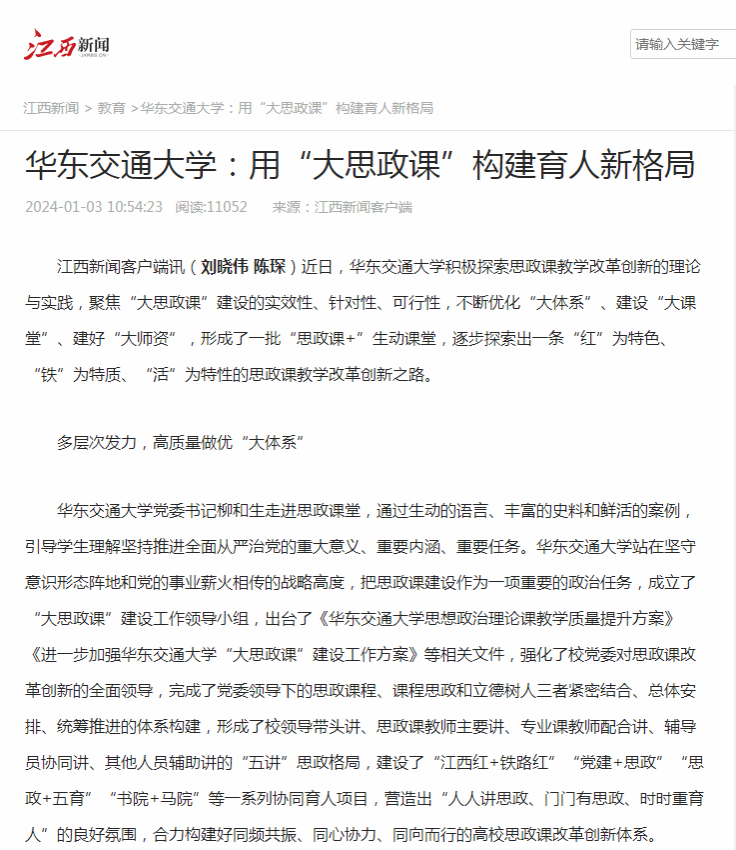 437必赢会员中心站在坚守意识形态阵地和党的事业薪火相传的战略高度,把思政课建设作为一项重要的政治任务,成立了“大思政课”建设工作领导小组,出台了《437必赢会员中心思想政治理论课教学质量提升方案》《进一步加强437必赢会员中心“大思政课”建设工作方案》等相关文件,强化了校党委对思政课改革创新的全面领导,完成了党委领导下的思政课程、课程思政和立德树人三者紧密结合、总体安排、统筹推进的体系构建,形成了校领导带头讲、思政课教师主要讲、专业课教师配合讲、辅导员协同讲、其他人员辅助讲的“五讲”思政格局,建设了“江西红+铁路红”“党建+思政”“思政+五育”“书院+马院”等一系列协同育人项目,营造出“人人讲思政、门门有思政、时时重育人”的良好氛围,合力构建好同频共振、同心协力、同向而行的高校思政课改革创新体系。