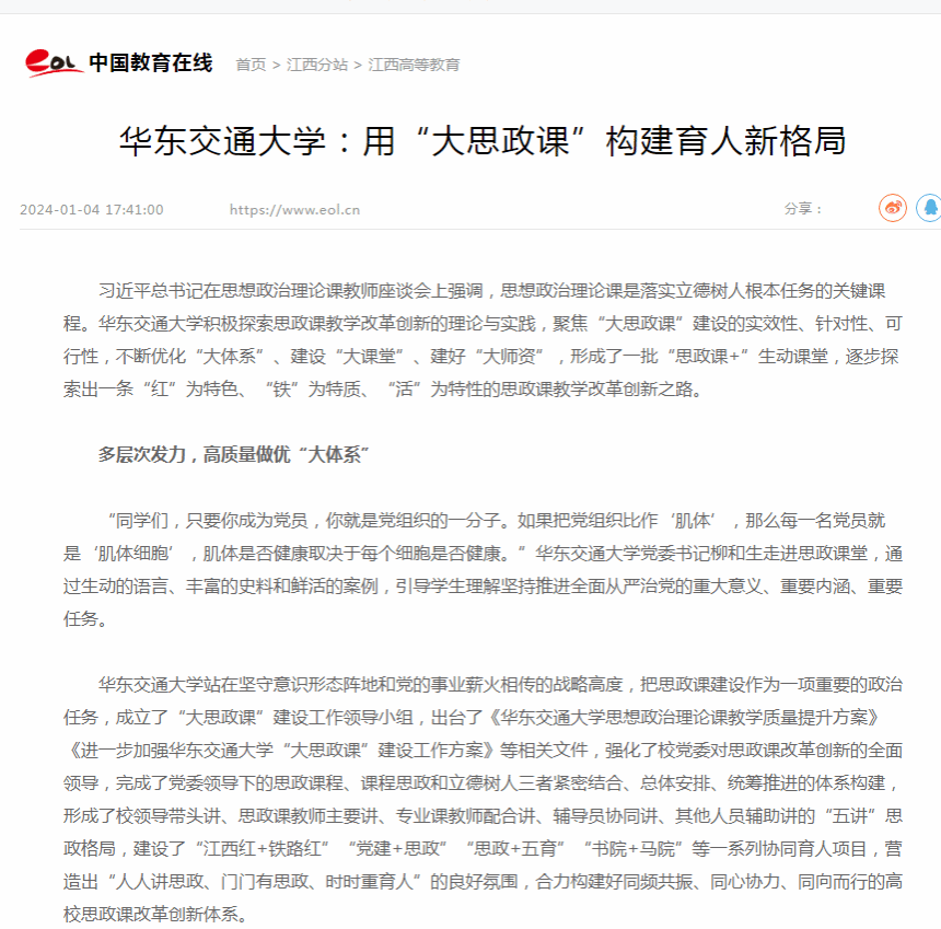 437必赢会员中心站在坚守意识形态阵地和党的事业薪火相传的战略高度,把思政课建设作为一项重要的政治任务,成立了“大思政课”建设工作领导小组,出台了《437必赢会员中心思想政治理论课教学质量提升方案》《进一步加强437必赢会员中心“大思政课”建设工作方案》等相关文件,强化了校党委对思政课改革创新的全面领导,完成了党委领导下的思政课程、课程思政和立德树人三者紧密结合、总体安排、统筹推进的体系构建,形成了校领导带头讲、思政课教师主要讲、专业课教师配合讲、辅导员协同讲、其他人员辅助讲的“五讲”思政格局,建设了“江西红+铁路红”“党建+思政”“思政+五育”“书院+马院”等一系列协同育人项目,营造出“人人讲思政、门门有思政、时时重育人”的良好氛围,合力构建好同频共振、同心协力、同向而行的高校思政课改革创新体系。