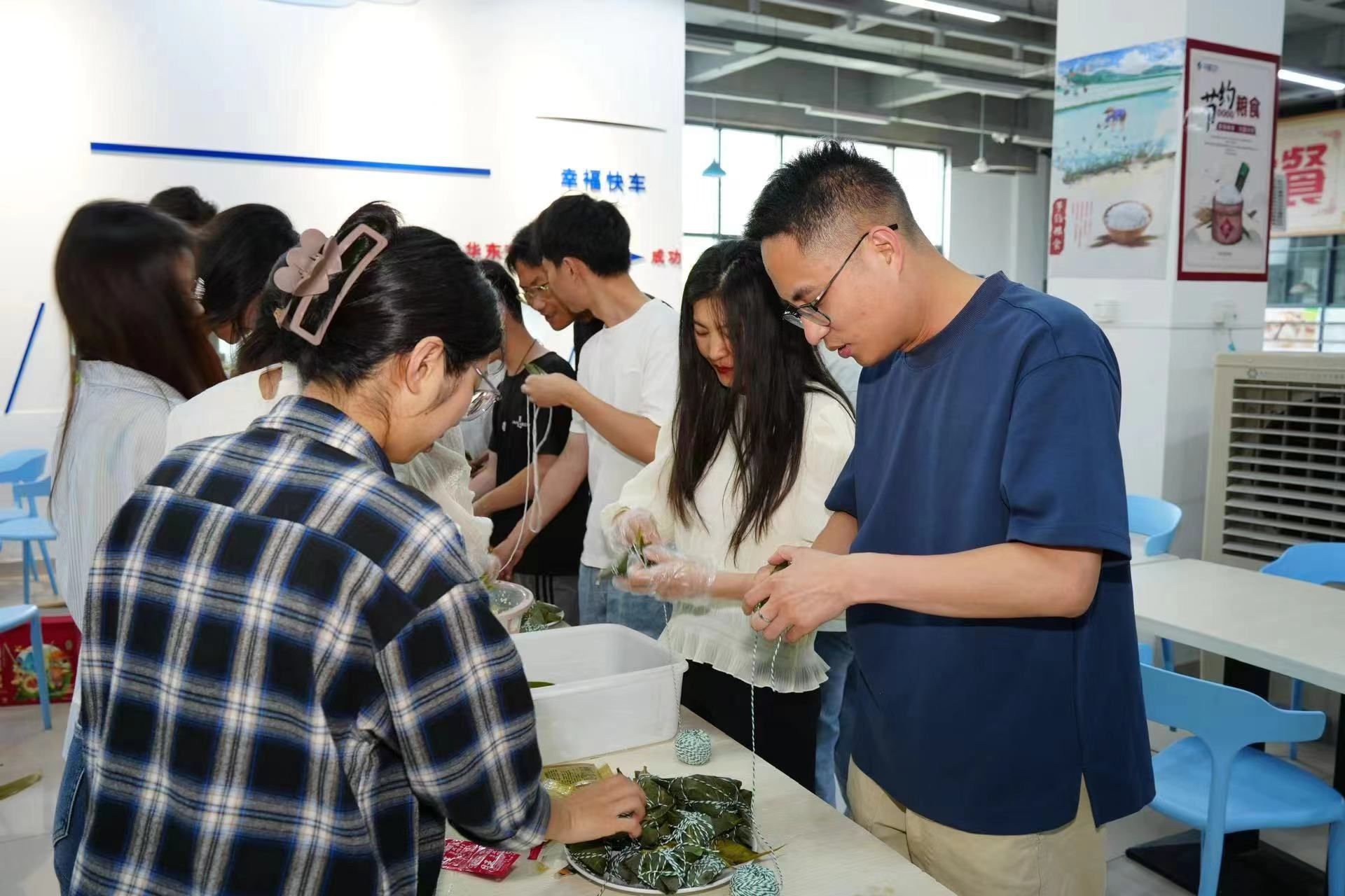 在热闹的气氛中,大家各展所长,分工合作,将粽叶挽成漏斗状,填上糯米、馅料、扎绳,再封口捆扎,巧手翻飞,将节日的祝福包裹进一个个饱满可爱的粽子中。不一会儿,三角的、四角的、长条的,形状各异的粽子在大家的互帮互助中完成了。活动过程中,大家彼此交流包粽子的手法和技巧,一派欢声笑语,洋溢着迎接端午佳节的浓厚氛围。