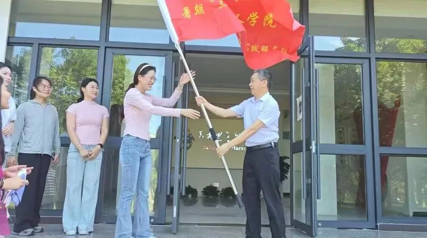 陈和金为团队授旗并叮嘱研究生们要牢固树立安全意识,将所学理论知识与乡村实际相结合,深入基层、了解民情、服务群众,在实践中受教育、长才干、做贡献,展现交大形象和马院担当。
