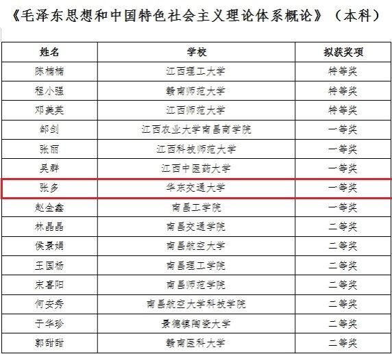 本次比赛共有454名高校思政课教师报名参赛,分为硕博、本科、专科三个层次,共设立14个参赛组别。经过线上提交作品和现场教学展示两个环节,况贵燕获《习近平新时代中国特色社会主义思想概论》(本科组)一等奖;张多获《毛泽东思想和中国特色社会主义理论体系概论》(本科组)一等奖;王涛获《思想道德与法治》(本科组)一等奖。