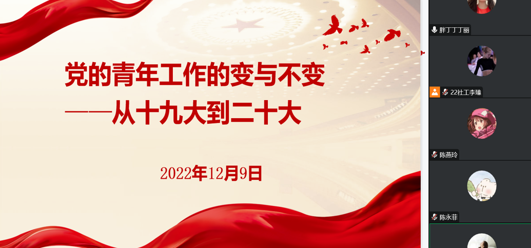 为进一步营造学习宣传贯彻党的二十大精神的浓厚范围,以实际行动推动党的二十大精神落实见效。12月9日晚,437必赢会员中心线上开展党的二十大精神学习宣讲,由院团委书记丁丽领学,学院全体团干部参加。