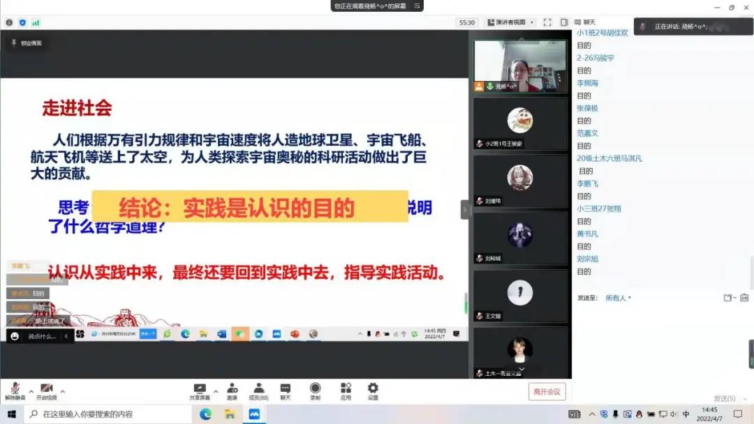不仅是育人途径的多重探索,如何通过时事热点联系课堂重难点也是教师们的关切所在。在《马克思主义基本原理概论》课上,该校杨霞飞老师则以如何认识理解时代热点问题为导入,从专业的视角解疑释惑,用科学和理性说服人,从而激发学生的理论兴趣;以“学习+讨论+答疑”的综合形式为手段,保障线上教学效果;以“线上测验+线下实践”为载体,强化学生线上学习成效;以“线上调研+线上直播”为依托,实时把握学生学习动态,形成一套完整的,具有前瞻性、针对性和可操作性的课程教学一体化方案。
