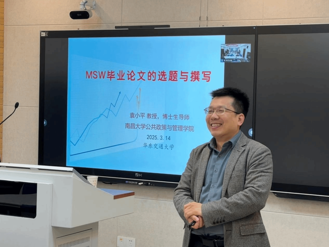 为提升学院研究生学术研究能力,规范毕业论文写作, 3月14日,学院特邀南昌大学公共政策与管理学院副院长、博士生导师袁小平教授作题为《MSW毕业论文选题与撰写》的学术讲座。